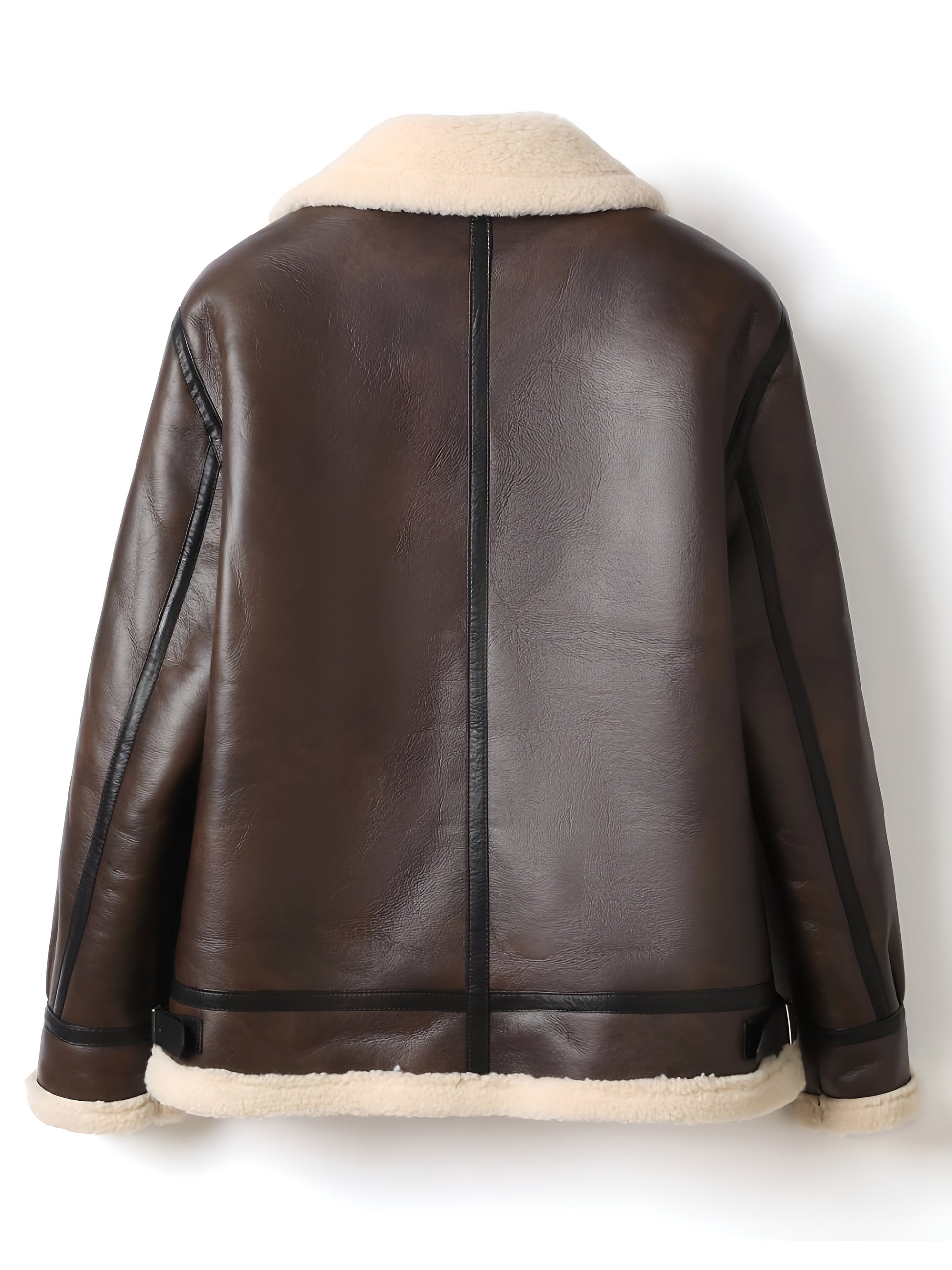 Verfijn je garderobe met dit diepbruin leren motorjack, gevoerd met een genereuze schapenvacht binnenkant. Ontworpen om bescherming en comfort te bieden, omhult het de silhouette met warmte terwijl het een tijdloze en verfijnde stijl uitstraalt. Een karakteristiek stuk dat je met vertrouwen vergezelt zodra de temperaturen dalen.