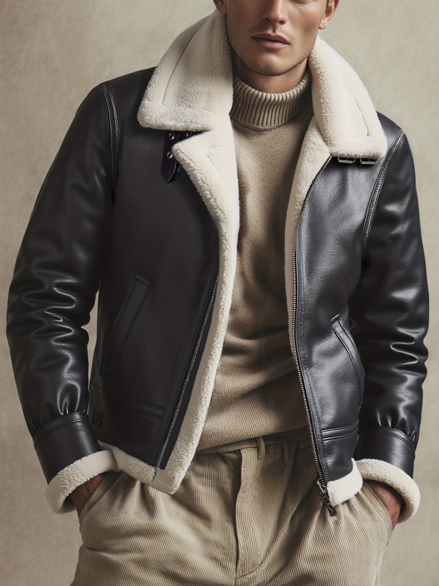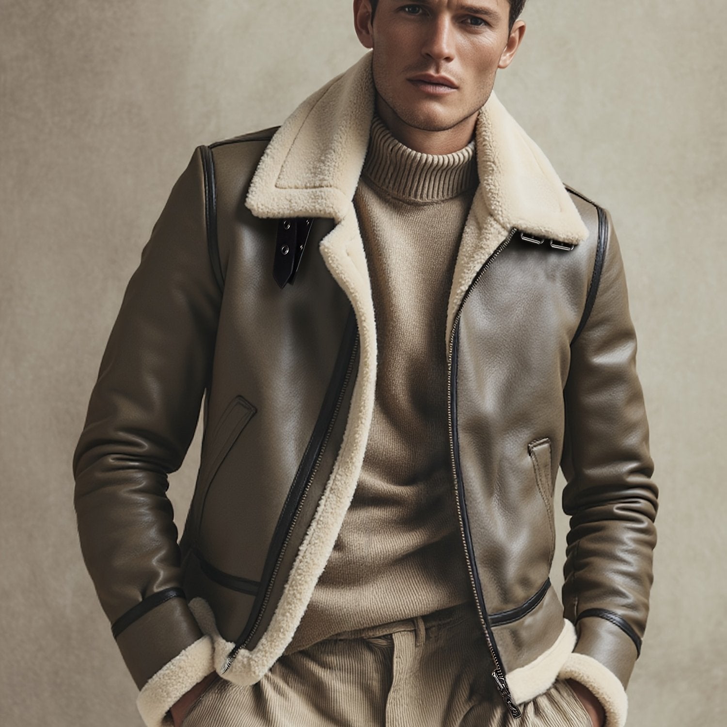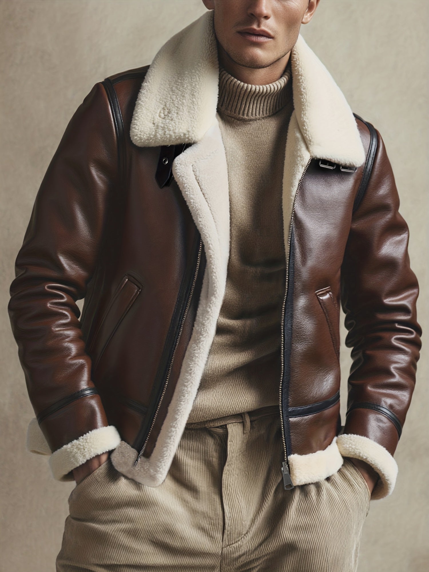 ✓ Iconische stijl – Herinterpretatie van de pilotenesthetiek, diepbruin leer en contrasterende kraag voor een premium uitstraling.